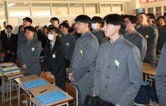 2年生が教室に戻った後、3年生が会場に入り引き続き、終了式が行われました。