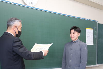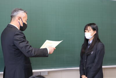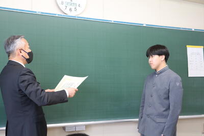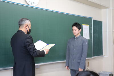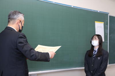 式の終了後、教室へ戻った卒業生は、担任の先生から一人ひとり証書を手渡され、各々、保護者やクラスメイト、担任の先生へこれまでの感謝を述べました。