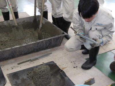 品質のよいコンクリートをつくるために必要な材料の選択、配合設計、作業の管理を学ぶことはもちろんですがチームワークや道具の扱い、効率的な作業も重要なこととして学びます。