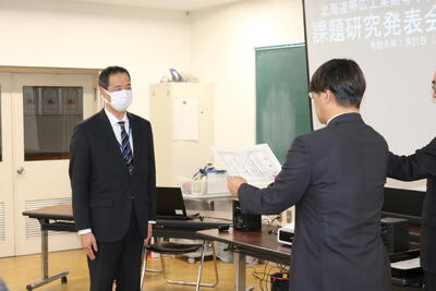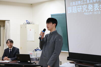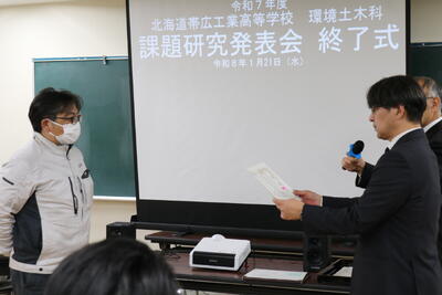 1月21日に課題研究発表会と終了式が行われました。課題研究における探求学習にご協力いただいた国土交通省北海道開発局帯広開発建設部5事業所様、東光舗道株式会社様、株式会社伊豆倉組様、東日本冨士新道路株式会社様、株式会社北開水工コンサルタント様、稲田小学校様にご来校いただきました。
