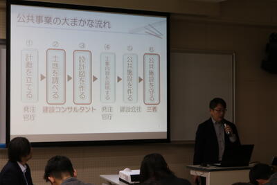 最初に官公庁の説明が行われました。発注業務など官公庁が果たす役割をご説明いただきました。